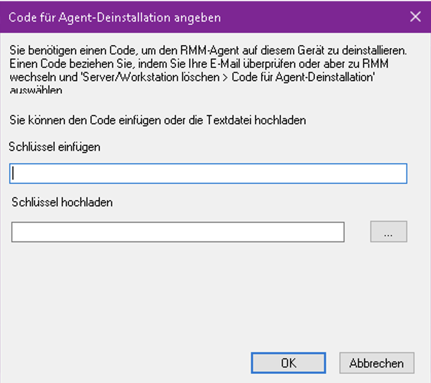 Bei Tausch der Hardware oder vor einen Neuinstallation muss das RMM Tool komplett deinstalliert werden. Durch die Deinstallation wird auch die Lizenz für ein neues Gerät wieder freigegeben. Die folgenden Schritte erklären die Deinstallation: